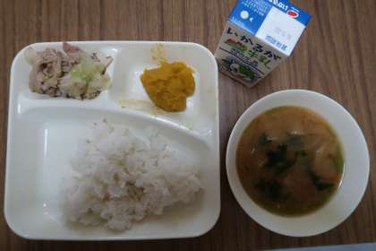 今日の献立は、豚肉とまいたけのいためもの、つみれ汁、かぼちゃういろう、ごはん、牛乳です。