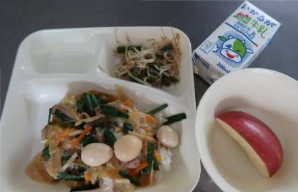 中華丼には、豚肉、うずら卵のほかに、はくさい、たまねぎ、たけのこ、にんじん、にら、しいたけなどのたくさんの具を使い、うま味を出しました。これに、今から旬を迎えるりんごも組み合わせました。みんなしっかり食べていましたよ。