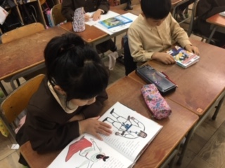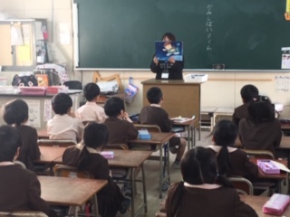 水曜日、1時間目が始まる前は全校読書タイムです。隔週で図書委員会児童が、低学年の教室を回っています。今日は、学級での読書。先生に紙芝居を読んでもらったり、好きな本を読んだり。2年生のお気に入りは、かいけつゾロリシリーズのようです。