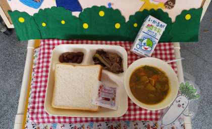 今日の献立は、牛肉の香味焼き、豚肉とだいこんのカレー煮、うずら豆のグラッセ、食パン、いちごジャム、牛乳でした。