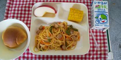 今日の献立は、チキントマトスパゲッティ、焼きとうもろこし、りんご、ミニ黒糖パン、牛乳でした。