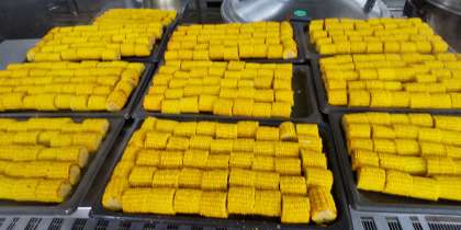青森県からのりんごを組み合わせた献立で、子どもたちにも人気でどのクラスも食缶は空っぽでしたよ。写真右は、とうもろこしを蒸し焼きにしたところです。