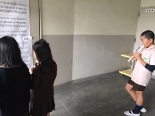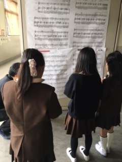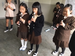 校長室横の防火扉前に集まって、休み時間ごとにリコーダーの練習をしている3年生。「名探偵コナン」「アイデア」の、楽譜が貼ってあるのです。音を聞きつけて、教頭先生も一緒に。2月の旭区子ども文化祭に出演する予定です。
