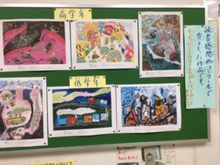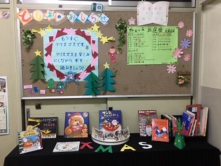 クリスマス関連の絵本が並んでいます。図書室の掲示板には、昨年読書感想画コンクールで入選した絵がカレンダーになっていて、絵の部分だけ貼られています。
