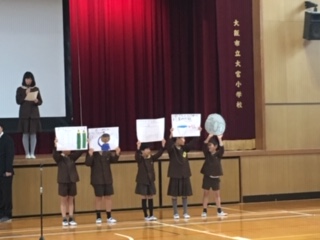 児童会からは、ユニセフ募金についての呼びかけがありました。みんなの協力でどんなことができるようになるか、調べたことを伝えました。募金は、明日から3日間です。