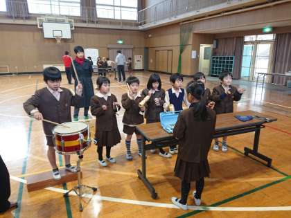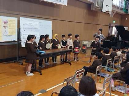 グループごとに「かぼちゃ」の曲に打楽器の伴奏を考えます。順番や組み合わせ、強弱を工夫して話し合いをし、何度も練習しました。はじめはリズムがつかめない子もどんどん上達しました。最後にみんなの前で発表しました。しっかり話し合ってグループで活動できていて素晴らしい、と先生方がほめていました。