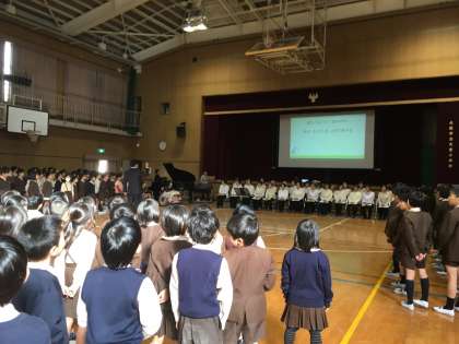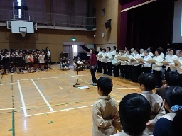 みんなの元気な「さんぽ」に合わせて入場したコーラスグループのみなさん。まずは全児童で「YUME日和」を、5・6年生で「COSMOS」を披露しました。楽しそうに大きな声で歌う子どもたちに、コーラスグループのみなさんはとても感動されていました。高学年の合唱も上手!とほめてくださいました。