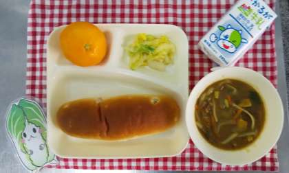 今日の献立は、カレーうどん、はくさいのおひたし、みかん、おさつパン、牛乳でした。
