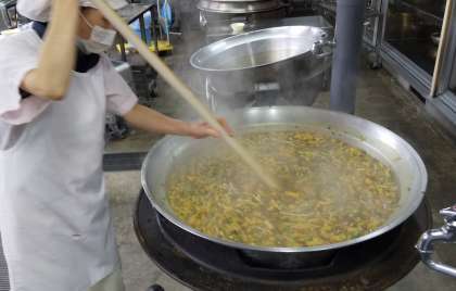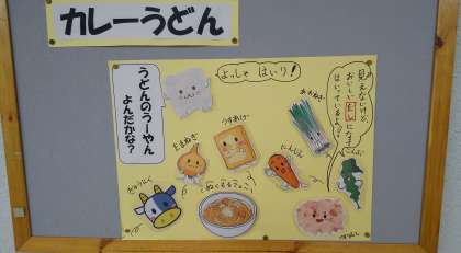 絵本作家の岡田よしたか先生による、絵本の読み聞かせがあり、子どもたちにも大人気の「うどんのうーやん」も読んでくださいました。今日の給食のカレーうどんも、たくさんの食材が入った寒い時期に「ぬくもる」人気献立です。子どもたちからも「うどんのうーやんや!」や、「うどんの中で一番好き」などの声がありました。