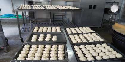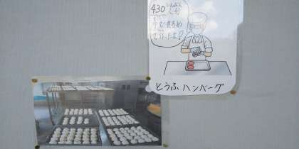 とうふハンバーグは、とうふとツナやみじん切りの玉ねぎなどを混ぜ合わせて、ひとつずつまとめて焼きます。年に一度の人気献立です。