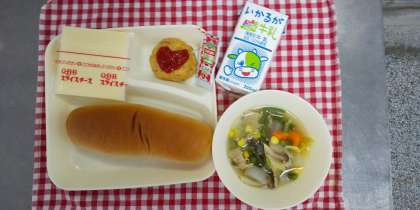 今日の献立は、とうふハンバーグ、スープ煮、スライスチーズ、黒糖パン、牛乳でした。