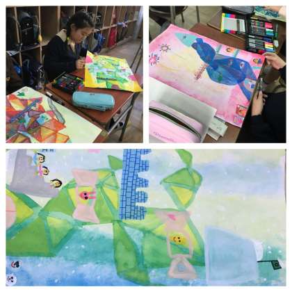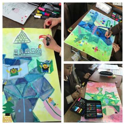 「三角形のお城」の作品です。自分のイメージに合わせて季節の色や風物を取り入れて工夫をしています。