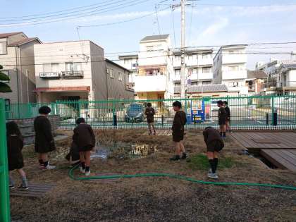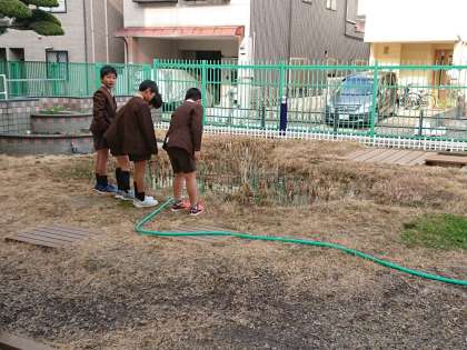 寒くて生き物が少なくなっていますが、ビオトープに子どもたちが集まっています。池の水が少なくなっていたので、ホースで水を足しました。よく見るとメダカが元気に泳いでいます。生き物や植物が、冬にどのような姿を見せるか、暖かい季節と比べるといいですね。新たな発見をしましょう!