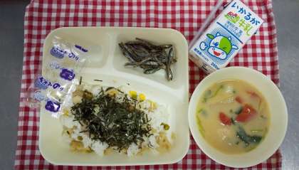 1月10日の給食には、れんこんのちらしずし、ぞう煮、ごまめが登場しました。