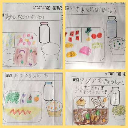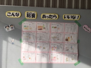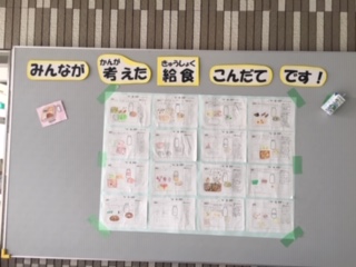 「こんな給食があったらいいな」「体にもよくておいしい給食だよ!」などの思いで、食べてみたい献立を考えました。玄関に掲示しています。