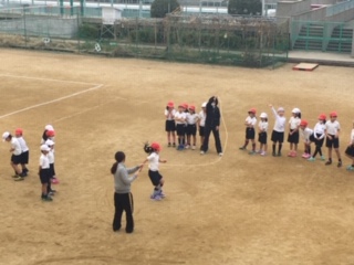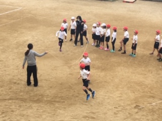 運動場で大縄跳びをしていました。連続して中に入っていくのはなかなか難しいですが、みんなで応援の掛け声をかけて頑張っていました!