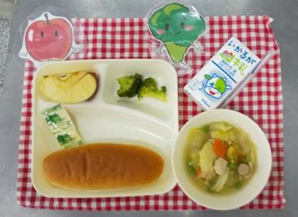 今日の献立は、鶏肉と野菜の洋風煮、ブロッコリーのサラダ、りんご、コッペパン、マーガリン、牛乳でした。