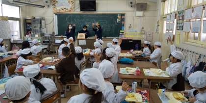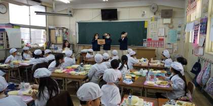今日は調理員さん達が、1年生の教室を訪問してくれました。