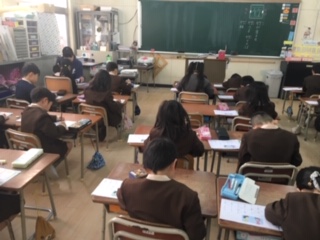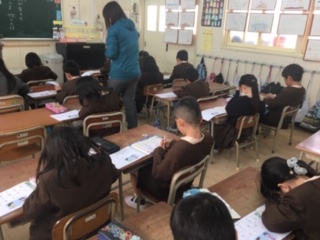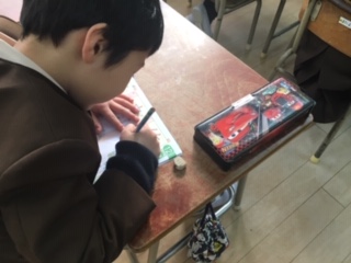 竹という感じを練習しました。竹やぶ、竹馬など知っている言葉を使って覚えています。「まつたけのたけ?」と子どもたち。残念!それは違うけれど、新しいことに興味を持ってよく考えています。