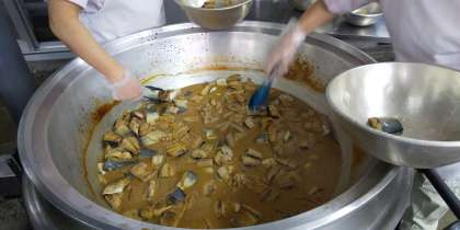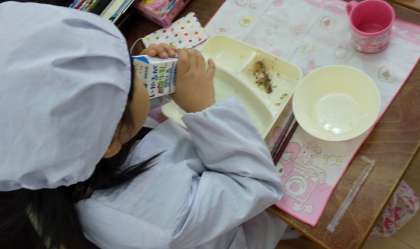 今日の献立は、さばのみそ煮、五目汁、もやしの甘酢あえ、ごはん、牛乳でした。給食室では、大きな釜でさばを昆布やしょうがと一緒に煮込みました。骨が多い魚ですが、栄養価が高く、脳の働きを助けるDHAや血管の病気を予防するEPAを含むので、子どもたちに食べて欲しい食材です。1年生もがんばって骨をよけて食べていました。