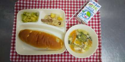 今日の献立は、中華おこわ、卵スープ、キャベツのオイスターソースいため、おさつパン、牛乳でした。