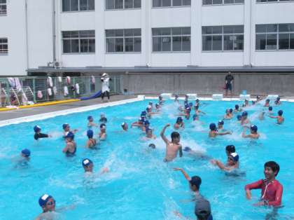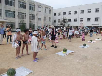 プール水泳の後は、スイカ割り。タオルで目を覆い、グルッと回って方向が定かではなくなって…。もう少し右!もっと前!いろんな声援が飛び交い、スイカも上手に割れました。