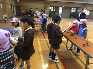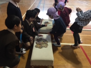 1年生が生活科で学習した昔遊び。すっかり名人になり、小さいお友達に教えてあげました。やさしく、分かりやすくを心がけ説明もしっかりできました。