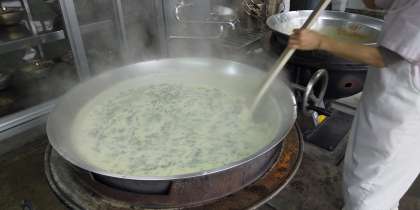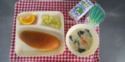 今日の献立は、ほうれん草のクリームシチュー、キャベツのサラダ、いよかん、黒糖パン、牛乳です。