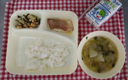 今日の献立は、赤魚のレモンじょうゆかけ、うすくず汁、高野どうふのいり煮、ごはん、牛乳でした。