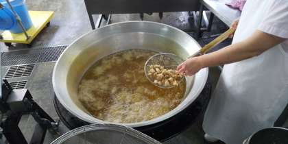 鶏肉は給食室で衣をつけて揚げたてに白ネギたっぷりの手作りのソースをかけました。とても好評でしたよ。