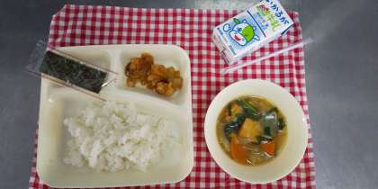 今日の献立は、あげ鶏のねぎソースかけ、あつあげとはくさいの中華煮、焼きのり、ごはん、牛乳でした。