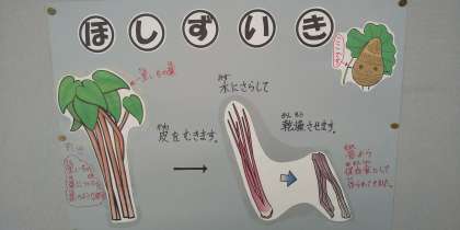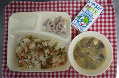 今日の献立は、鶏ごぼうご飯、干しずいきのみそ汁、焼きれんこん、牛乳でした。最近なかなか食卓に上がりにくくなったずいきが登場しました。日本では古くから、ずいきは出産後の女性にすすめて体力の回復を早めたとされ、腸をきれいにする働きもあるといわれています。みんなよく食べていましたが、具だくさんのみそ汁の中のどれがずいきか分からないまま食べている1年生もいました。ご家庭でもいかがでしょうか。