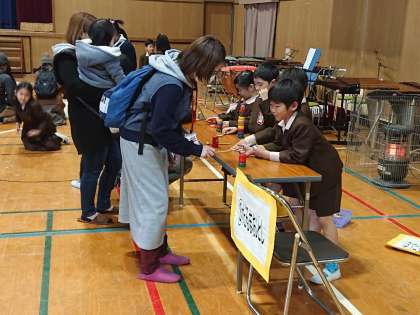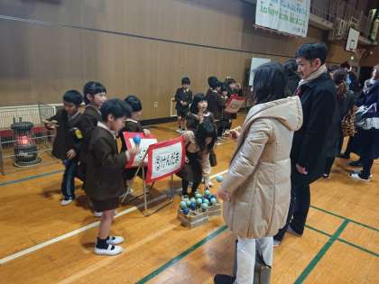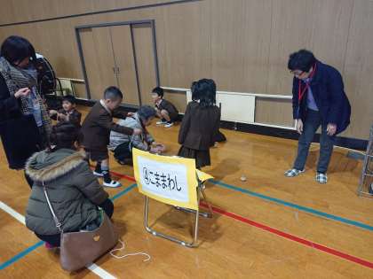 講堂で「1年生がんばったよ集会」をしました。保護者の方たちをお客さんにして、昔遊びをしました。子どもたちがけん玉などの技を披露し、その上達ぶりに保護者のみなさんが驚いていました。おばあさんもコマ回しを教えてくださり、いい交流となりました。
