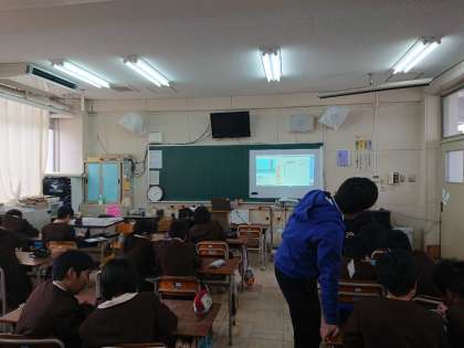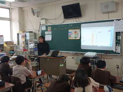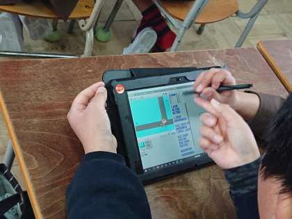 算数でプログラミング学習を行いました。タブレットでスクラッチというソフトを使いました。画面に出ているネコを動かして、正三角形などの形になるようにプログラムを打ち込みます。子どもたちはペアで相談しながら楽しんで学習しました。