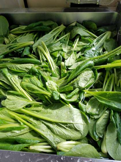 福岡県産のたくさんの小松菜をうすあげと煮びたしにしました。野菜が苦手な児童も「この味好き」と、どのクラスも食缶空っぽで返ってきました。