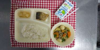 今日の献立は、さばの塩焼き、あつあげとさといもの煮もの、だいこんのみそ煮、ごはん、牛乳でした。