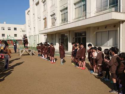 快晴の朝。6年生と一緒の朝会はこの日が最後です。