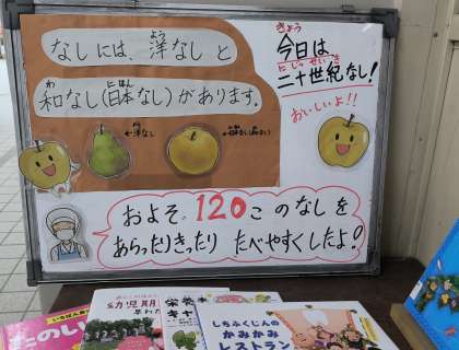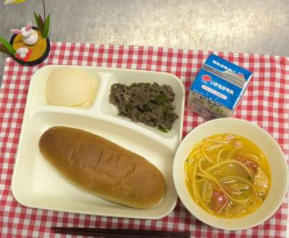 今日は、牛肉の香味焼き、トマトのスープスパゲッティ、なし(二十世紀)、黒糖パン、牛乳でした。