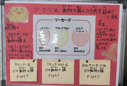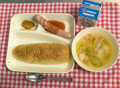 今日は、ウインナーのケチャップソース、スープ、焼きかぼちゃ、おさつパン、牛乳でした。食育ボードの答えは左から、ひつじ、ぶた、牛です。