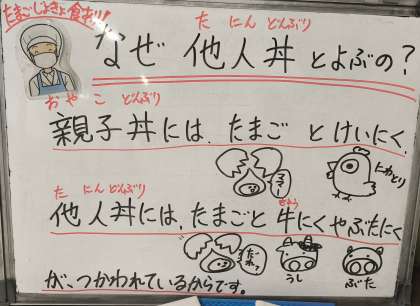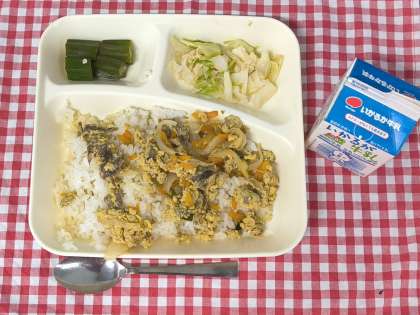 今日は、他人丼、ささみとキャベツのいためもの、オクラの甘酢あえ、牛乳でした。他人丼は卵除去食も用意しました。