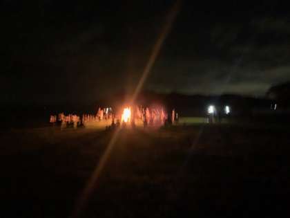 赤く燃える炎のもと、みんなで楽しんでいます。