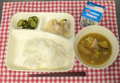 今日は、さけのしょうゆだれかけ、五目汁、高野どうふのいり煮、ご飯、牛乳でした。