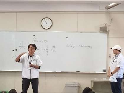 JAの方に来ていただき、お米の話や稲刈りの仕方を教えていただきました。