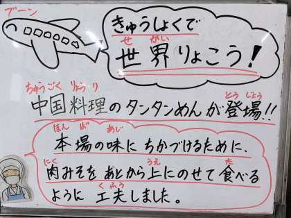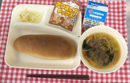今日は、タンタンめん、キャベツの甘酢づけ、おさつチップス、黒糖パン、牛乳でした。タンタン麺は野菜がたっぷり入った汁麺の上に手作りの肉味噌をかけて本場に近い味になるよう工夫しています。