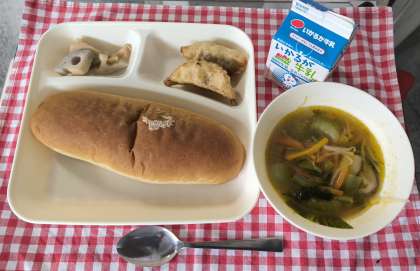 今日は、あげギョーザ、中華みそスープ、れんこんの中華だれかけ、黒糖パン、牛乳でした。