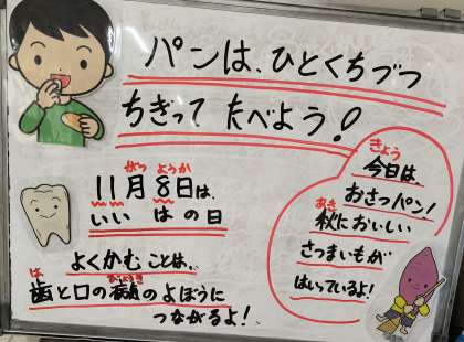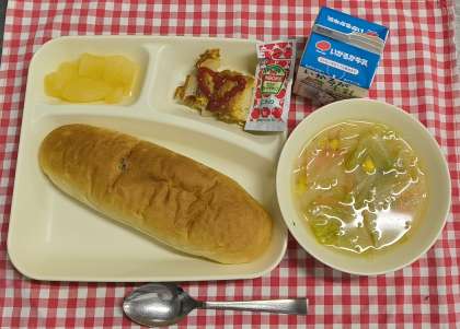 今日は、ツナポテトオムレツ(ケチャップ)、スープ、洋なし(缶詰)、おさつパン、牛乳でした。