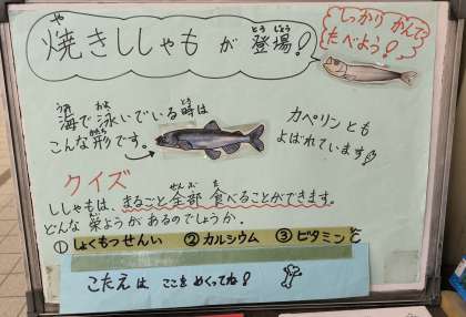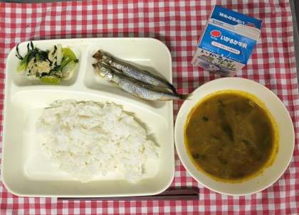 今日は、焼きししゃも、和風カレー汁、ささみとこまつなのいためもの、ご飯、牛乳でした。