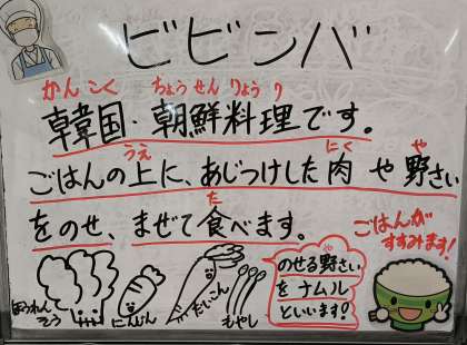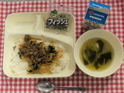 今日は、ビビンバ、わかめスープ、ミニフィッシュ、牛乳でした。