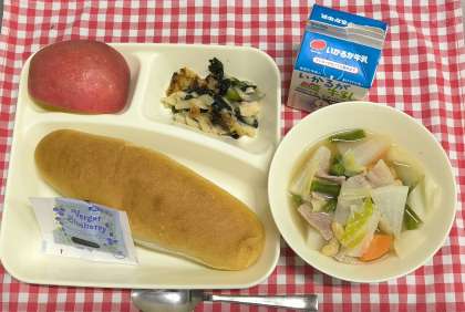 今日は、ほうれんそうのグラタン、てぼ豆のスープ煮、りんご、コッペパン、ブルーベリージャム、牛乳でした。