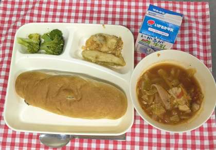 今日は、白身魚フリッター、ミネストローネ、ブロッコリーのサラダ、レーズンパン、牛乳でした。